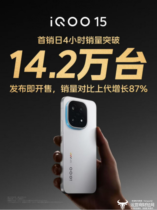 而在首销当日,iQOO15的市场表现同样强劲 ——首销日4小时iQOO15销量突破14.2万台,销量对比上代增长87%,种种数据不仅直观展现了iQOO15的市场号召力,也印证了iQOO15的产品实力!