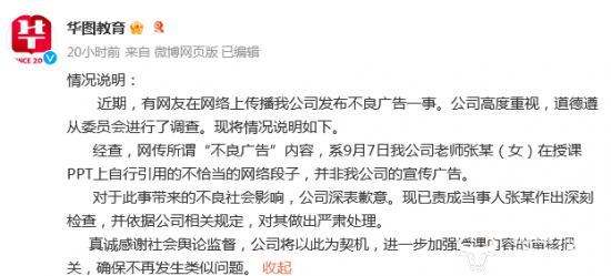但是到了当日下午,华图教育微博官方账号发布一则声明,表示经查,网传所谓“不良广告”内容,系9月7日公司老师张某(女)在授课PPT上自行引用的不恰当网络段子,并非其宣传广告。