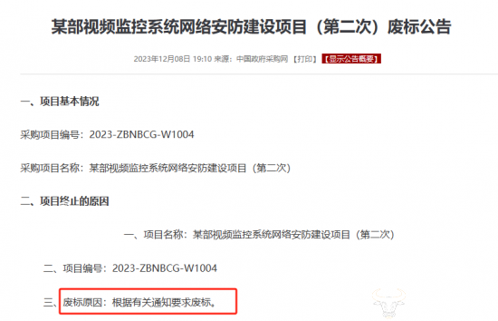 就在中标结果公布一个月后,2023年12月8日,该项目发布废标公告,废标原因并未详细公示,只是“根据有关通知要求废标”。需要注意的是,很多项目会出现中标结果更正的情况,一般来说就是原中标人更换,第二中标候选人变为中标人,但这个项目却是以废标结束。