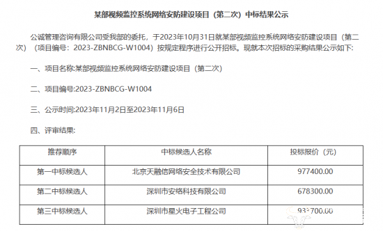 据了解,上述项目在2023年启动招标,根据2023年11月发布的(第二次)中标结果公示,北京天融信网络安全技术有限公司以97.74万元的报价成功中标。评审结果显示,深圳市安络科技有限公司以67.83万元的报价位列第二中标候选人;深圳市星火电子工程公司以93.37万元的报价位列第三中标候选人。