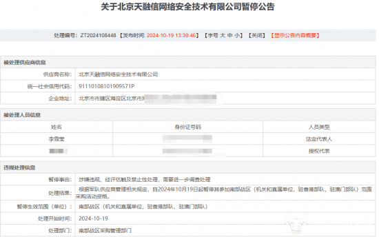根据供应商管理相关规定,北京天融信网络安全技术有限公司自2024年10月19日起被暂停参加南部战区范围采购活动资格。