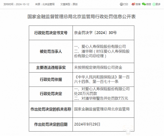 据国家金融监督管理总局北京监管局在10月12日发布的行政处罚信息显示,爱心人寿因未按规定使用保险公司资金,公司被罚款20万元,总经理潘华刚被警告并处罚款7万元。