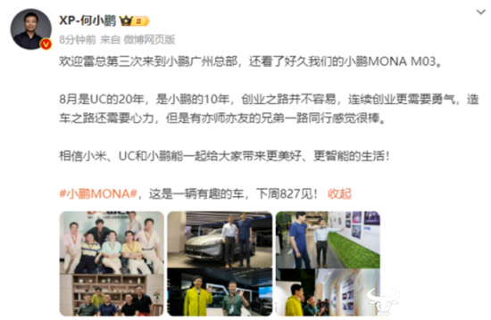 事实上,在MONA上市前夕,雷军就曾到访小鹏汽车总部并体验了小鹏MONA M03,何小鹏事后还曾公开发文表示:欢迎雷总第三次来到小鹏广州总部...8月是UC的20年,是小鹏的10年,创业之路并不容易,连续创业更需要勇气,造车之路还需要心力,但是有亦师亦友的兄弟一路同行感觉很棒......