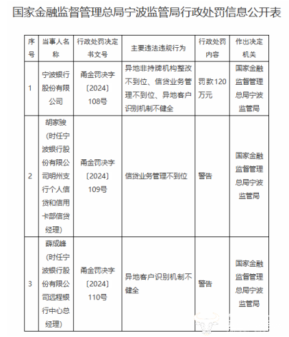 另外,胡家骏(时任宁波银行明州支行个人信贷和信用卡部信贷经理)和薛成峰(时任宁波银行远程银行中心总经理)分别因对信贷业务管理不到位和异地客户识别机制不健全负有责任,被予以警告。
