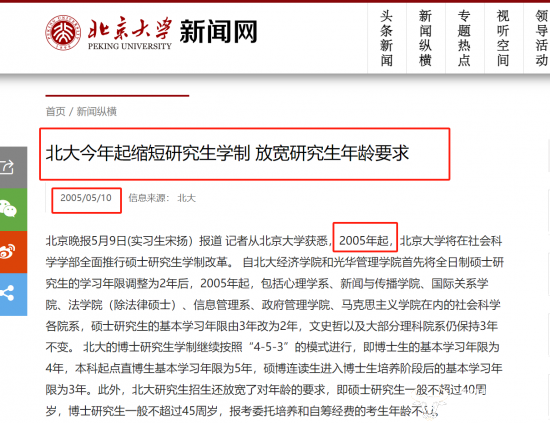2005年起,北京大学包括心理学系、新闻与传播学院、国际关系学院、法学院(除法律硕士)、信息管理系、政府管理学院、马克思主义学院在内的社会科学各院系,硕士研究生的基本学习年限由3年改为2年,文史哲以及大部分理科院系仍保持3年不变。