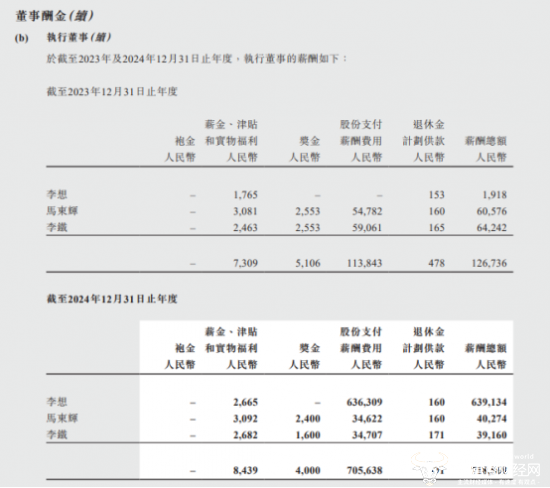 在这样的背景下,公司高管的薪酬也高得惊人,尤其是董事长兼CEO李想。据年报数据披露,2024年李想的薪酬总额为6.39亿元,乍一看还挺高的,但仔细观看其薪酬结构会发现,李想的薪酬由三部分组成,包括工资津贴266.5万元、退休金16万元以及高达6.36亿元的股份支付薪酬。