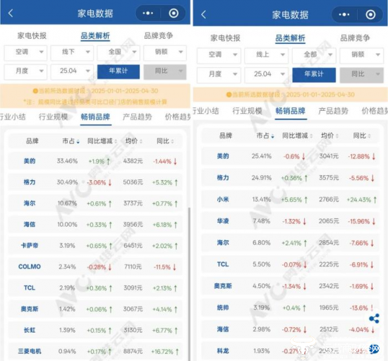 不过,奥维云网数据显示,2025年1-4月,空调市场市占率线下渠道,前五名分别是美的、格力、海尔、海信和卡萨帝,奥克斯排名第八名;在线上渠道,前五名是美的、格力、小米、华凌、海尔,奥克斯排名第七名,线上线下渠道都已跌下前五名。