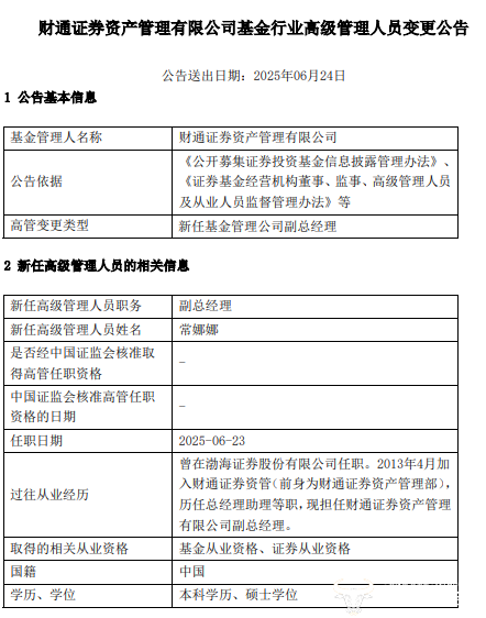 日前,财通证券资产管理有限公司(简称财通资管)发布公告,宣布常娜娜担任公司副总经理职位,其官网也已经更新了任职信息。下面,运营商财经网将揭秘这个人。
