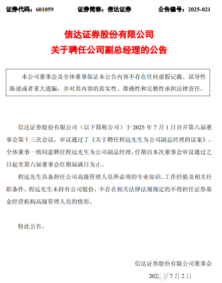 近日,信达证券股份有限公司(简称信达证券)发布公告,披露已经聘任程远担任副总经理职位。运营商财经网将梳理此人的过往经历。