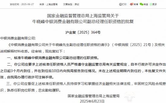 近日,国家金融监督管理总局上海监管局发布批复,核准牛晓峰中银消费金融有限公司副总经理的任职资格。这一任命引发业内关注。运营商财经网试图揭秘此人的过往经历。