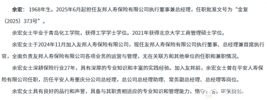 值得关注的是,在去年10月,余宏因退休后返聘任职期满,而卸任了平安人寿总经理等相关职务。就在一个月后,她加入了友邦人寿,拟任总经理。