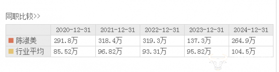 李巧巧2020年薪酬为71.19万元,2021年上升至80.8万元,2022年略降至79.39万元,2023年达到薪酬峰值98.92万元,2024年再次小幅回落。而陈淑美同期薪酬除2023年为137.3万元外,其余年份均维持在300万元左右。