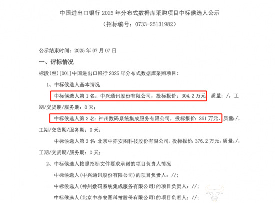第一中标候选人为中兴通讯,其投标报价为304.2万元;第二中标候选人是神州数码系统集成公司,其投标报价为261万元;第三中标候选人为中亦科技,其投标报价为376.2万元。