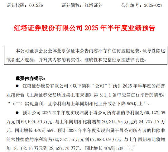 7 月 9 日,红塔证券发布2025年半年度业绩预告,其中,预计公司实现归母净利润在6.51亿到6.96亿元之间,同比增长45%到55%;预计实现归母扣非净利润为 6.34 亿元到 6.79 亿元,同比增长 40% 到 50%。引发金融市场关注。