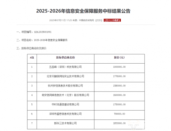 日前,深圳信息职业技术学院发布《2025-2026年信息安全保障服务》中标结果。知名供应商奇安信、新华三双双意外落选,具体什么情况呢?