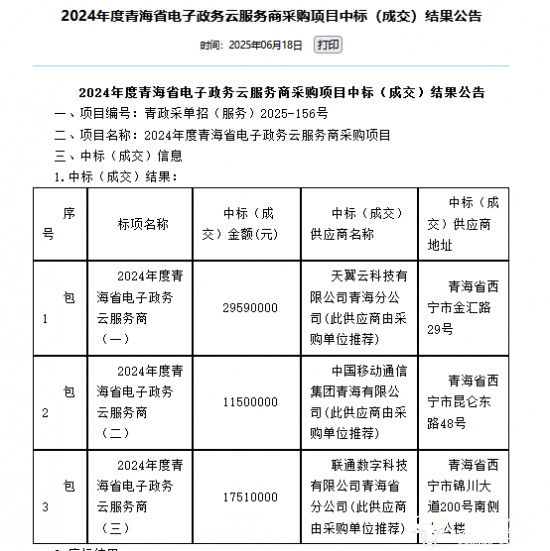 6月18日,项目中标结果正式出炉,天翼云科技有限公司青海分公司成功中标预算最高的标包一;青海移动中标标包二;联通数科科技有限公司青海省分公司中标标包三。