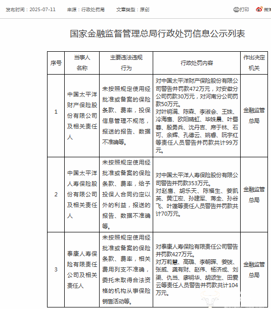 日前,泰康人寿保险有限责任公司(简称泰康人寿)收到一则行政处罚,国家金融监督管理总局对其采取了,警告并罚款427万元。其相关责任人也被警告,并罚款共计104万元。下面,运营商财经网将梳理此次事件的过往经历。