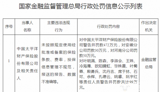 据官方发布的行政处罚公开表,太平洋产险因“未按规定使用经批准或备案的保险条款、费率”“投保信息管理不规范”以及“报送的报告、数据不准确”等三个问题,被处以警告并罚款472万元。安徽和河南分公司,也分别被处以30万到50万元的罚款。其中相关负责人均被警告并处罚款共计99万元。