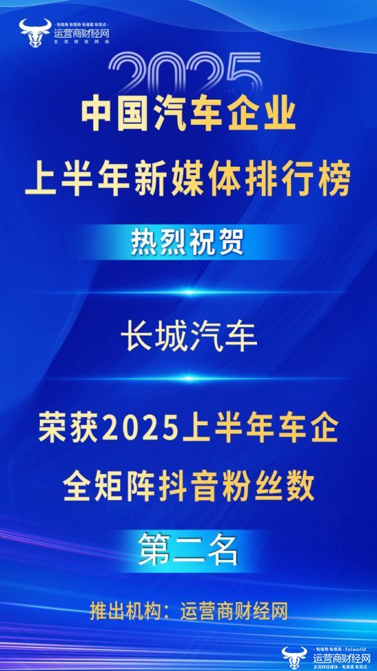 经过搜索整理,由运营商财经网独家编排的“2025上半年知名车企全矩阵抖音粉丝数前十名”榜单正式发布,其中,长城汽车凭借1276.9万的粉丝数位居第二位!