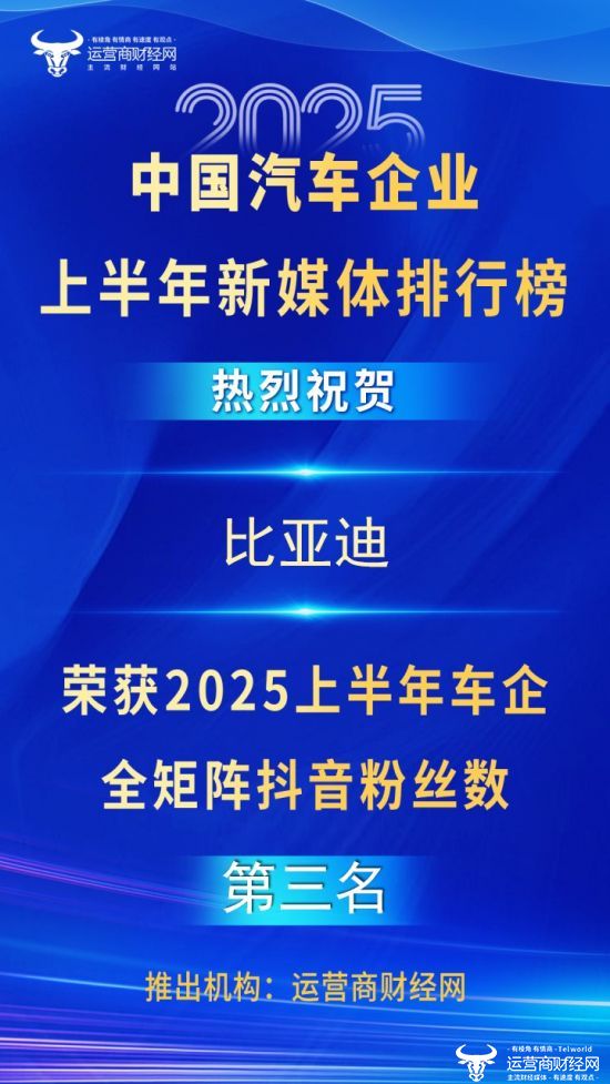 经过搜索整理,由运营商财经网独家编排的“2025上半年知名车企全矩阵抖音粉丝数前十名”榜单正式发布!凭借1040.7万的粉丝数,比亚迪成功上榜,排名第三!这是非常靠前的排名,表明比亚迪的抖音号运营很成功。