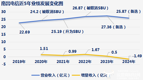在2024年中,南昌电信实现营收规模为25亿多元,远比前两年的营收规模都低。也因此,南昌电信2024年的增量收入为负,较2023年下滑了1亿多元,继续成为集团备选的战略业务单元之一。