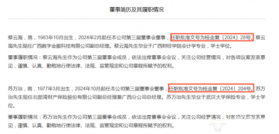然而截至目前,北部湾保险的官网上,并没有更新林峰的相关任职信息。在梳理时发现,其公布的高管信息中,均包含国家金融监督管理总局广西监管局的任职批复。