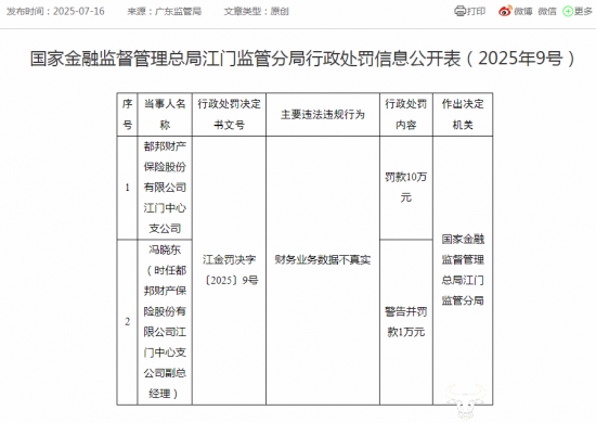 日前,国家金融监督管理总局江门监管分局发布一则公告,都邦财产保险股份有限公司(简称都邦财险)旗下的江门中心支公司,被处罚10万元,其相关责任人也被点名,备受关注。下面,运营商财经网将梳理本次事件的经过。