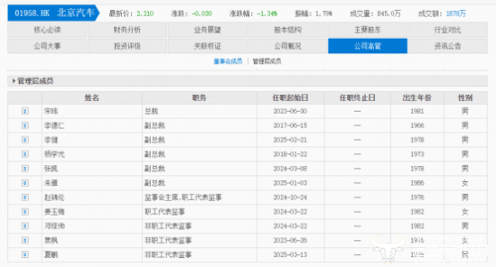 目前,北汽股份对外披露的管理层名单包括董事长王昊、总裁宋玮以及副总裁李德仁、李健、杨学光、张凯和朱雁,丁祖学已经不再以副总裁的身份出现在高管名单中。