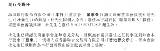 近期,渤海银行发布公告,杜刚因“个人原因”辞任副行长一职,引发业内关注。