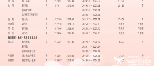 同时,财报还公布了副行长的薪酬情况。除去李建国、齐君、邓蓓三位2025年才正式上任的副行长以外,杜刚以201.55万元位列薪酬第一位,而后是谢凯的174.06万元。赵志宏、靳超由于当年任期不满一年,只拿到了两位数的薪酬,分别是84.72万元以及90.14万元。