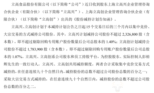 值得注意的是,在公司业绩表现亮眼的同时,立高食品近日发布股东减持股份预披露公告,公告显示,上海立高兴企业管理咨询合伙企业、上海立高创企业管理咨询合伙企业计划减持公司股份,其中,立高兴计划减持公司股份不超过2,326,800股,立高创计划减持公司股份不超过1,783,900股。
