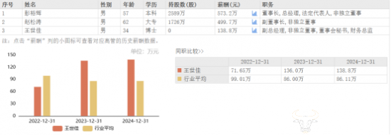 值得一提的是,董事长彭裕辉2024年薪酬由407.2万元大涨至573.2万元,上涨166万元,涨幅最大,副董事长赵松涛薪酬也大幅上涨至499.7万元。