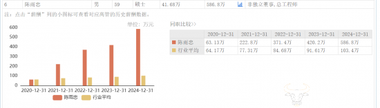 此外,陈雨忠近几年的薪酬待遇也相当不错,已连续四年涨薪。从2020年到2024年,陈雨忠的年薪分别为63.13万、222.8万、371.4万、420.2万、586.8万,只去年一年就涨薪了166.6万元。比总裁薪酬还高,2024年总裁王大勇薪酬为533.1万。