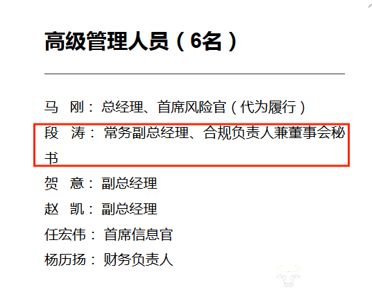 段涛任职合规总监不久后,在2022年9月,因公司存在经营管理活动与股东、关联方之间未保持独立,以及个别分支机构未按照规定配备专职合规人员等两项问题,段涛作为相关负责人对上述问题负有管理责任,被上海监管局出具警示函。