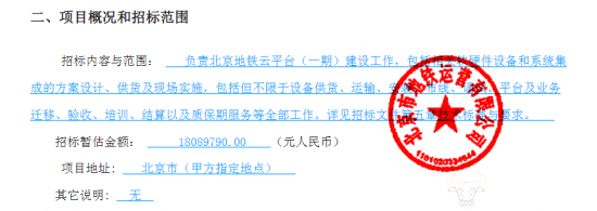 7月10日,该项目发布招标公告。据招标文件,北京地铁云平台(一期)建设工作包括相关软硬件设备和系统集成的方案设计、供货及现场实施,包括但不限于设备供货、运输、安装、布线、调试、平台及业务迁移、验收、培训、结算以及质保期服务等全部工作。