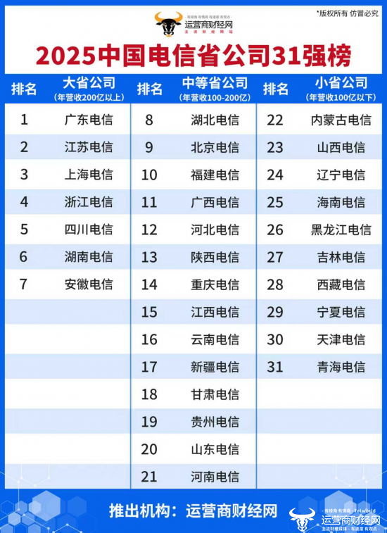 为让业界清晰了解三大运营商旗下各省公司的发展情况,由运营商财经网独家打造的“2025中国电信省公司31强”排行榜单正式出炉。