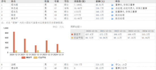 与此同时,公司高管薪酬也普遍下降,多位降幅过百万元。蔡良平2024年薪酬为353.3万元,相较于2023年的500.0万元,下降了146.7万元,但他的薪酬仍高于另一位副总经理陈宏。