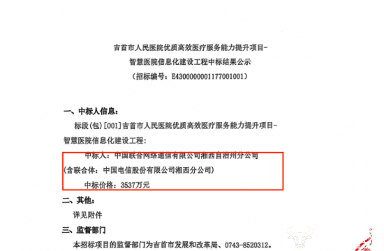 日前,“吉首市人民医院优质高效医疗服务能力提升项目-智慧医院信息化建设工程”终于公示中标结果!在两个多月的招标过程中,该项目两次遭遇暂停,如今终于有了结果,本次运营商财经网试图揭秘具体情况。