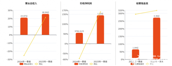 根据2025年4月30日,长飞光纤发布的2025年一季报数据显示,营业总收入为28.94亿元,同比较去年同期上涨21.23%,归母净利润为1.52亿元,同比较去年同期上涨161.91%;经营活动现金净流入为4.36亿元,同比较去年同期增加3.31亿元,同比较去年同期上涨318.57%,创造了连续四年上涨的好成绩。