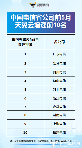 据悉,这10家增速最快的省公司分别是广东电信、江苏电信、四川电信、河南电信、河北电信、浙江电信、安徽电信、湖南电信、上海电信和福建电信。