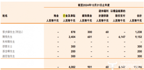 运营商财经网在整理年报数据时发现,2024年陈飞的薪酬水平在所有已经披露薪酬数据的董事及高级行政人员中处于首位,为915.2万元。主要包括薪金、绩效以及股份权益结算,其中股份权益结算在薪酬中占比最大。