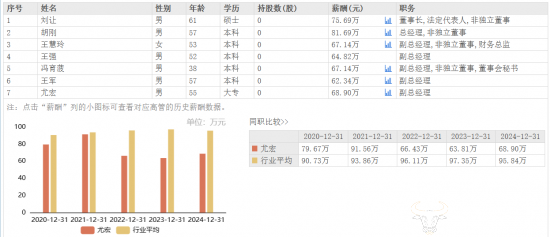 而在副总薪酬纷纷上涨时,董事长刘让和总经理胡刚的薪酬却下降了。2024年,刘让薪酬为75.69万元,胡刚薪酬为81.69万元,相较于2023年的75.86及81.86,各自微降了0.17万元。