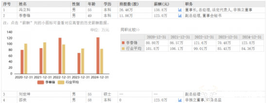 而在去年公司业绩下滑的情况下,公司高管薪酬却增长了。李春锋2024年薪酬为123.0万元,相较于2023年的70.40万元,上涨了52.6万元。而董事长冯立科2024年薪酬为138.8万元,相较于2023年的77.67万元,上涨了61.13万元,是公司高管中涨薪最多的。