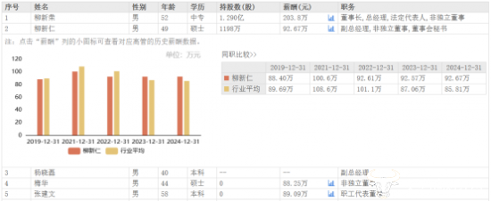 而在去年公司业绩下滑的背景下,柳新仁2024年薪酬为92.67万元,相较于2023年的92.57万元,几乎没变化。而董事长柳新荣的薪酬由2023年的209.1万元下调至了2024年的203.8万元,减少了5.3万元。尽管如此,柳新荣仍是公司最高薪酬,并且是唯一一个薪酬超百万的。