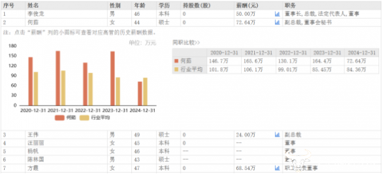 在去年公司业绩下滑的背景下,公司高管薪酬也大幅下降。何茹2024年薪酬为72.64万元,相较于2023年的164.4万元,下降了91.76万元,是公司高管中薪酬下降幅度最大的。尽管如此,何茹去年仍为公司最高薪酬,高于董事长李俊龙。董事长李俊龙去年薪酬为50.00万元,相较于2023年的96.65万元,下降了46.65万元。