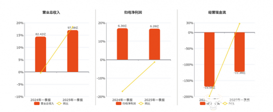从中天科技发布的2025年一季度财报来看,公司实现营业总收入97.56亿元,同比增长18.37%;归母净利润6.28亿元,同比下降1.33%;扣非净利润5.97亿元,同比增长20.45%;经营活动产生的现金流量净额为-11.36亿元,上年同期为-15.59亿元。