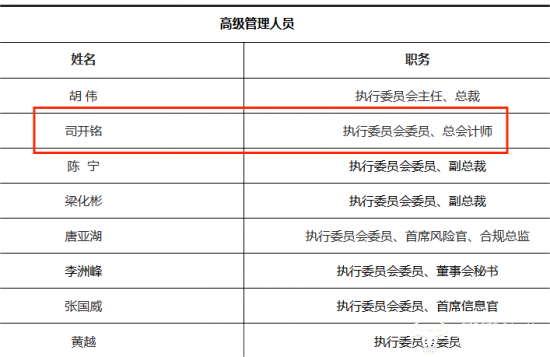 司开铭的官网排名仅在总裁胡伟之后。虽然排名很高,但是其 2024 年薪酬为 104.8 万元,与副总裁陈宁、首席风险官唐亚湖的薪酬相同,并列公司董监高薪酬排名第 5 位,也并没有太高。