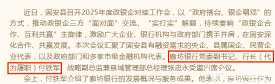 9月初,在廊坊银行掌上资讯公众号上,付铁军以廊坊银行行长(代为履职)的身份出席会议。这是2022年后,时隔三年,廊坊银行行长人选首次传出公开动向。具体情况如何,运营商财经网将进行梳理。