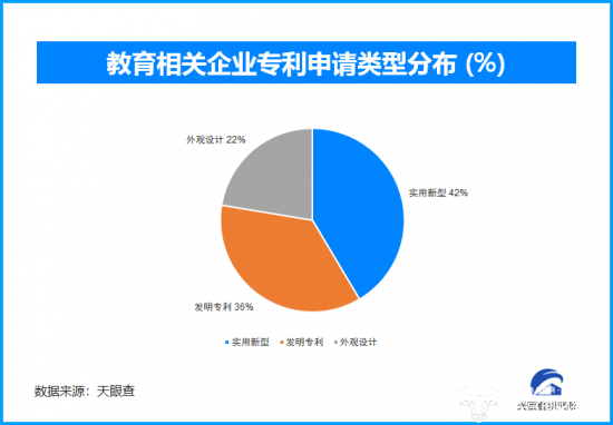 天眼查专业版数据显示,截至目前我国教育领域共有9.7万余条专利申请信息。其中实用新型专利和发明专利占比最多,分别为占比42%和36%。可以看到教育领域的科技基因正在持续加码。此外,外观设计专利占比22%。