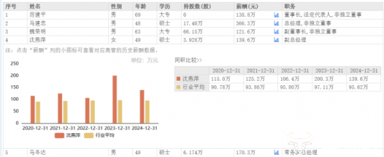 而在公司去年业绩下滑背景下,公司高管薪酬也纷纷下降。沈燕萍2024年薪酬为139.6万元,相较于2023年的200.3万元,下降了60.7万元,高于董事长厉建平的138.8万元,但已低于常务副总经理马冬达。马冬达2024年薪酬为170.3万元,相较于2023年的240.5万元,下降了70.2万元。